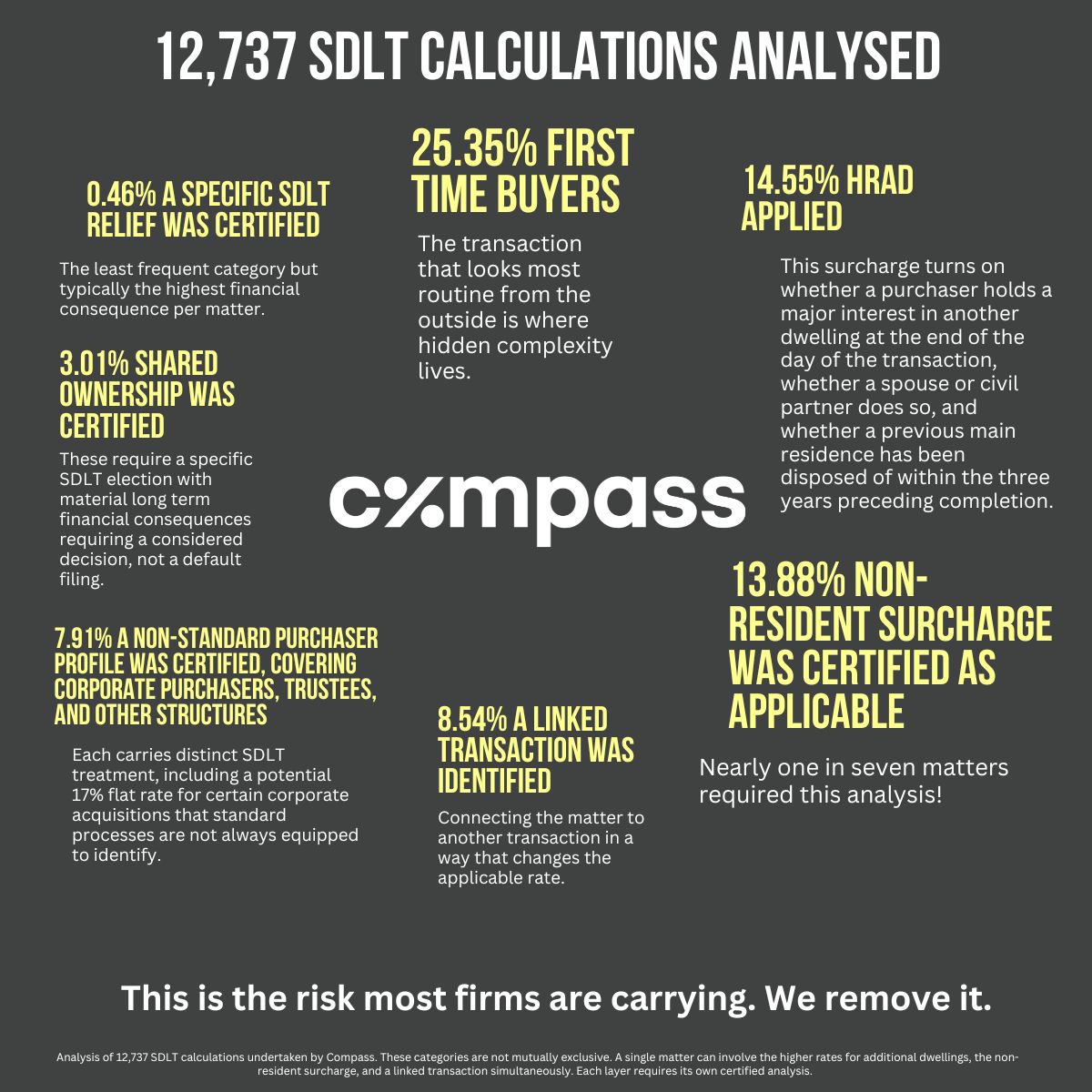In 8.54% of matters, a linked transaction was certified, connecting the matter to another transaction in a way that changes the applicable rate. In 7.91% of matters, a non-standard purchaser profile was certified, covering corporate purchasers, trustees, and other structures each carrying distinct SDLT treatment, including a potential 17% flat rate for certain corporate acquisitions that standard processes are not always equipped to identify.